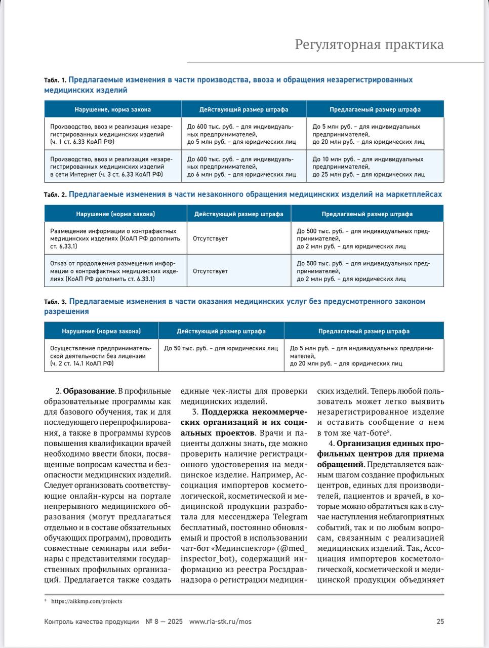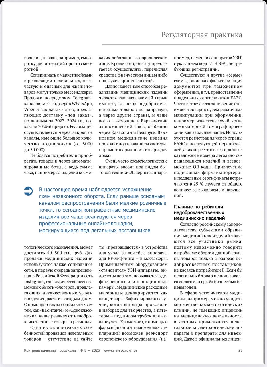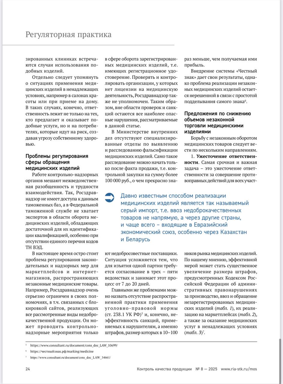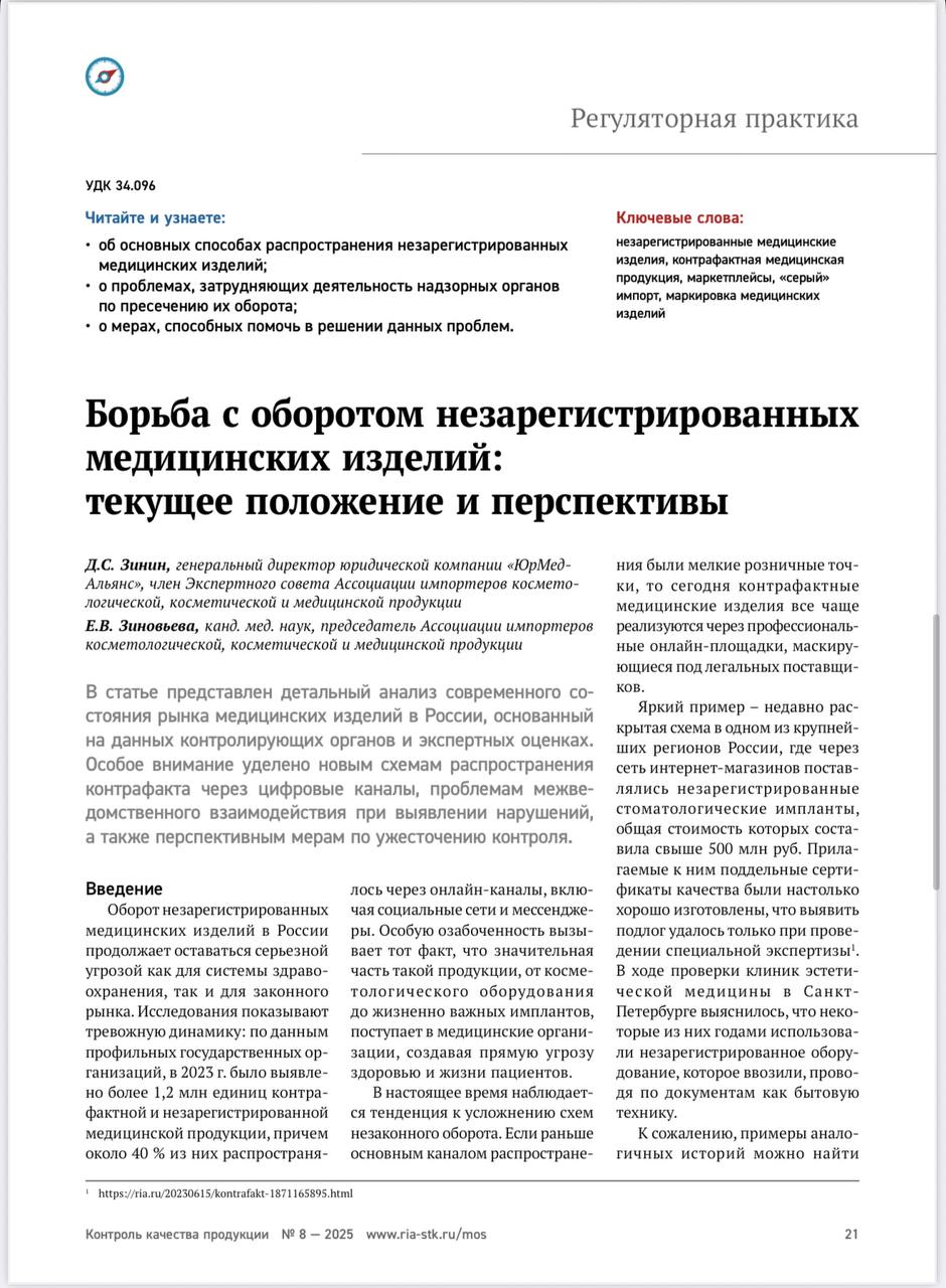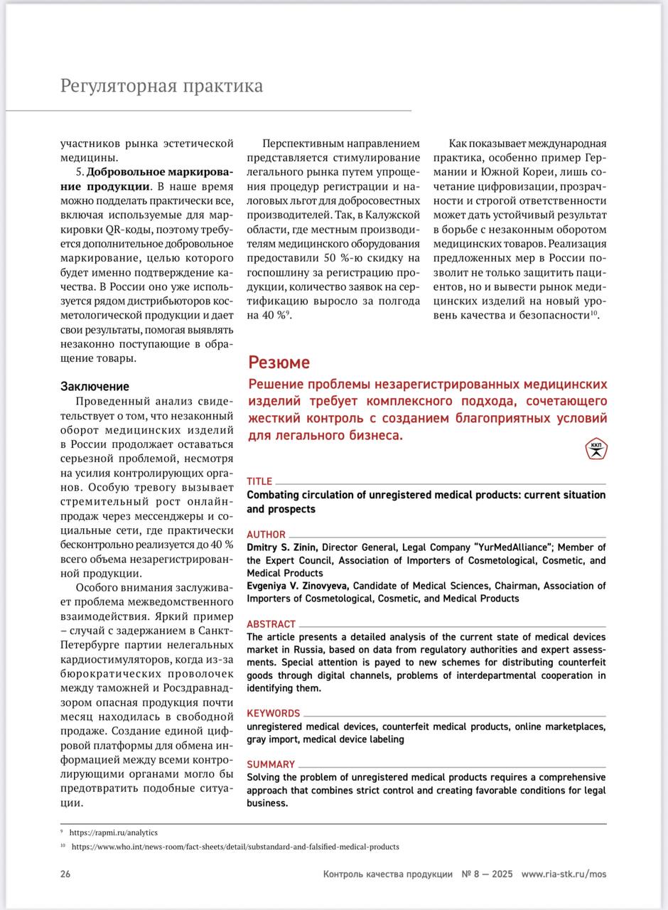 В международном журнале для производителей и экспертов по качеству «Контроль Качества продукции» вышла новая статья экспертов нашей ассоциации не просто о борьбе с оборотом незарегистрированных медицинских изделий и анализом текущей ситуации, но и с нашими предложениями.